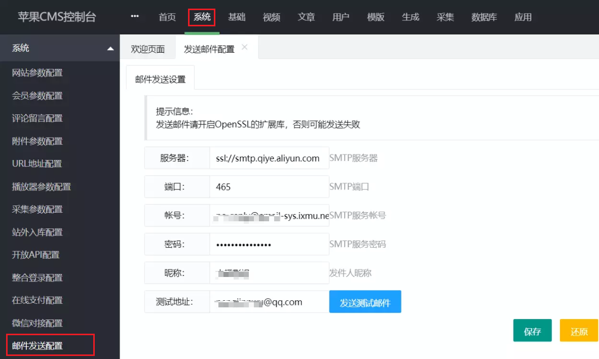 苹果cms v10使用smtp发送邮件需要开启OpenSSL扩展库支持,否则会发送失败。这里小伙伴们不需要担心,因为现在的服务器openssl扩展库是必备的,已经默认内置了。
