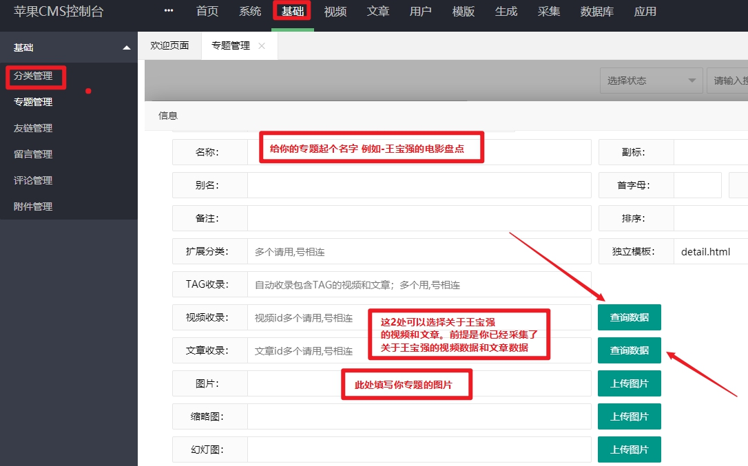 1.进入苹果cms后台按顺序点击 基础>>>专题管理>>>添加2.进入添加页面后先给你的专题起个响亮的名字,下面的视频收录和文章收录是可以添加关于你的专题内容有关联的文章和视频,前提是你网站采集了相关的数据。然后就是上传你专题的图片