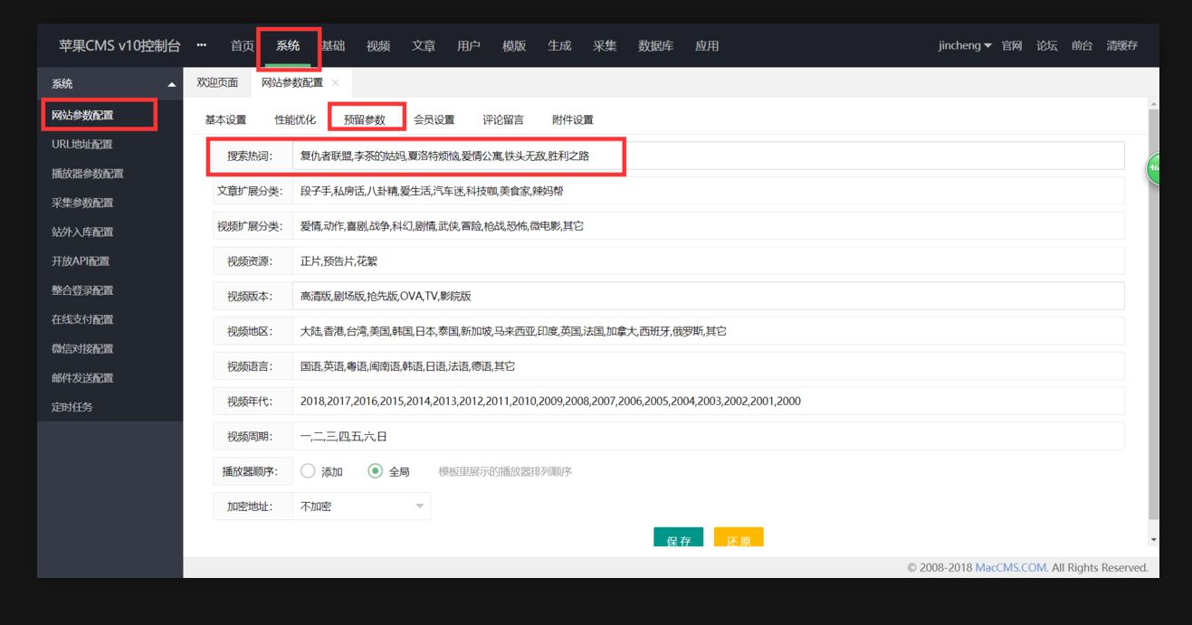 具体操作流程:系统-> 网站参数配置 -> 预留参数 ->搜索热词(用英文逗号分隔)