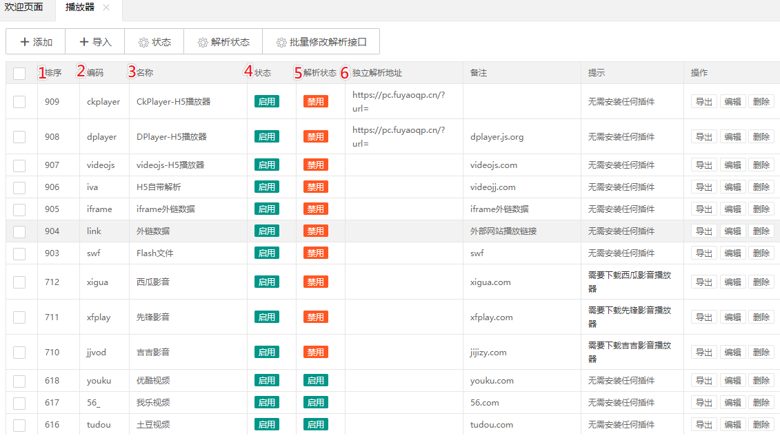 ④状态:播放器的启用开关按钮,启用则有效,禁用则关闭