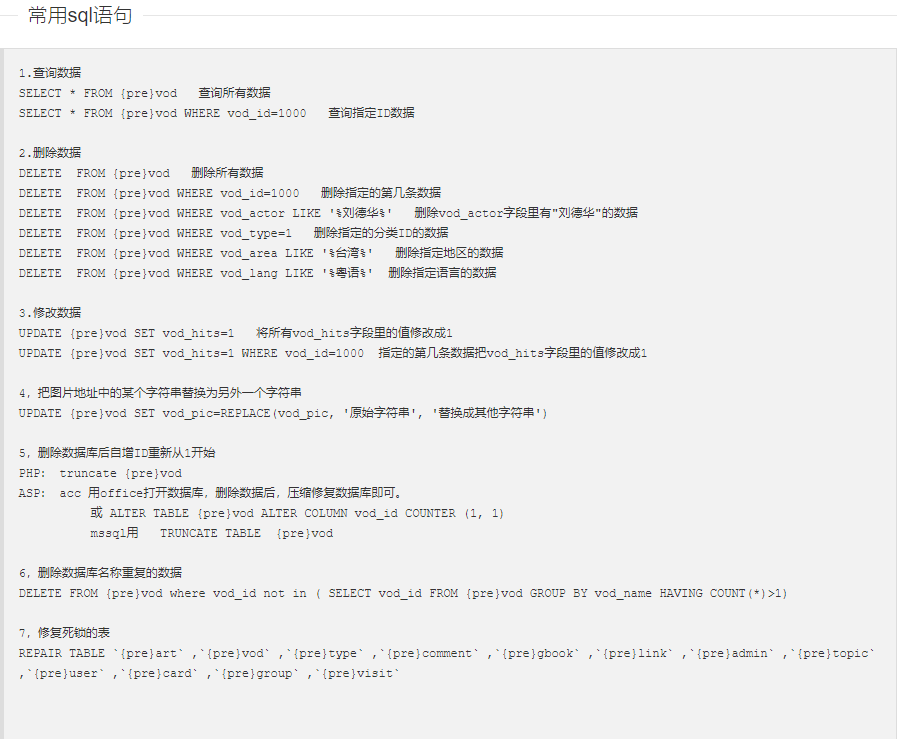 DELETE FROM {pre}vod 删除所有数据 DELETE FROM {pre}vod WHERE vod_id=1000 删除指定的第几条数据 DELETE FROM {pre}vod WHERE vod_actor LIKE '%刘德华%' 删除vod_actor字段里有"刘德华"的数据 DELETE FROM {pre}vod WHERE vod_type=1 删除指定的分类ID的数据 DELETE FROM {pre}vod WHERE vod_area LIKE '%台湾%' 删除指定地区的数据 DELETE FROM {pre}vod WHERE vod_lang LIKE '%粤语%' 删除指定语言的数据