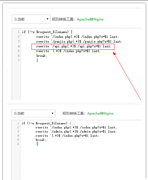 if (!-e $request_filename) { rewrite ^/index.php(.)$ /index.php?s=$1 last; rewrite ^/admin.php(.)$ /admin.php?s=$1 last; rewrite ^/api.php(.)$ /api.php?s=$1 last; rewrite ^(.)$ /index.php?s=$1 last; break; }