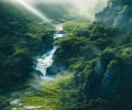 人间仙境山水瀑布图片 人间仙境 山水瀑布 云雾缭绕 雾气 云雾 山水 瀑布 瀑布流 树木 绿树 树...