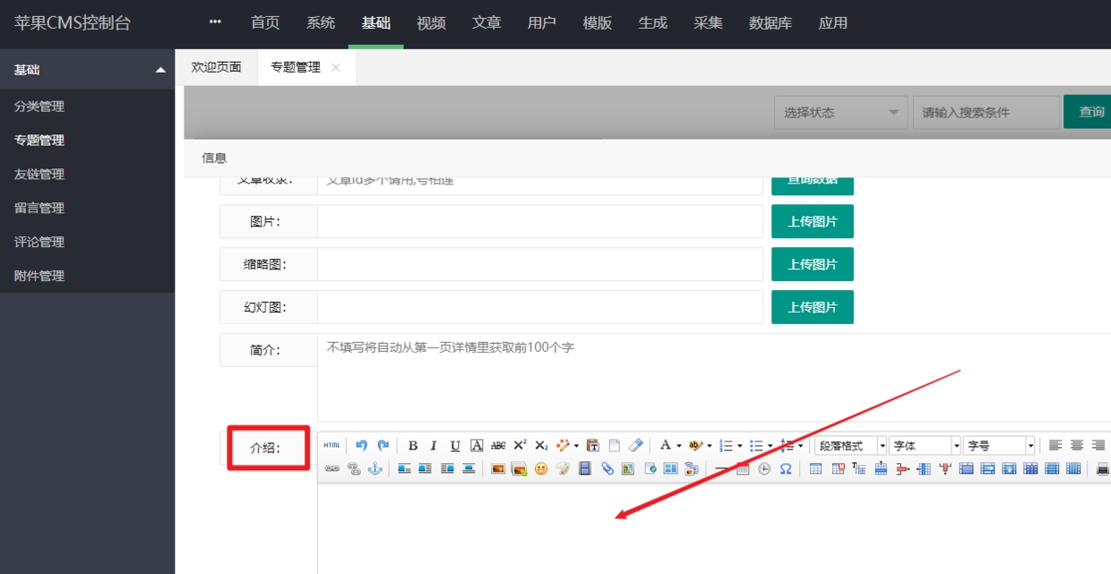 1.进入苹果cms后台按顺序点击 基础>>>专题管理>>>添加2.进入添加页面后先给你的专题起个响亮的名字,下面的视频收录和文章收录是可以添加关于你的专题内容有关联的文章和视频,前提是你网站采集了相关的数据。然后就是上传你专题的图片