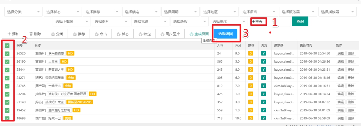 3.我们以添加关于王宝强的视频数据来举例:点击上面图片的查询数据到达下面图片的页面 我们在搜素框里填写‘王宝强’进行搜素,得到以下关于王宝强的影视数据 我们可以全选或是单选,选好后点击选择返回再点击确定就添加成功了。