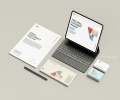 一组平板电脑和办公文具组合的品牌设计展示psd样机,总共有5个样机,样机内包含有:带键盘的平板电脑、...