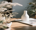 暖冬风格生活静物摄影图片 桌子上杂志旁边的白色瓶子,造型简洁纯粹,暖冬风格,周围植物,前景植物褪色...